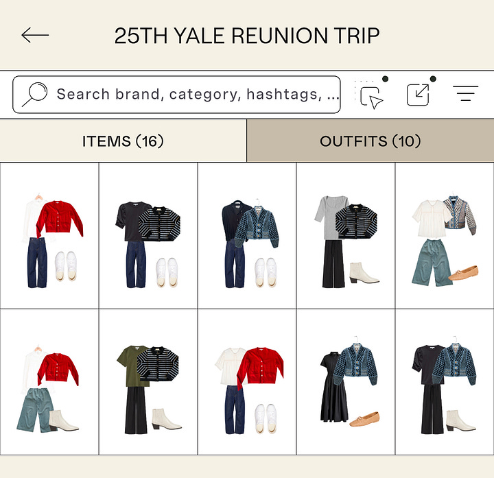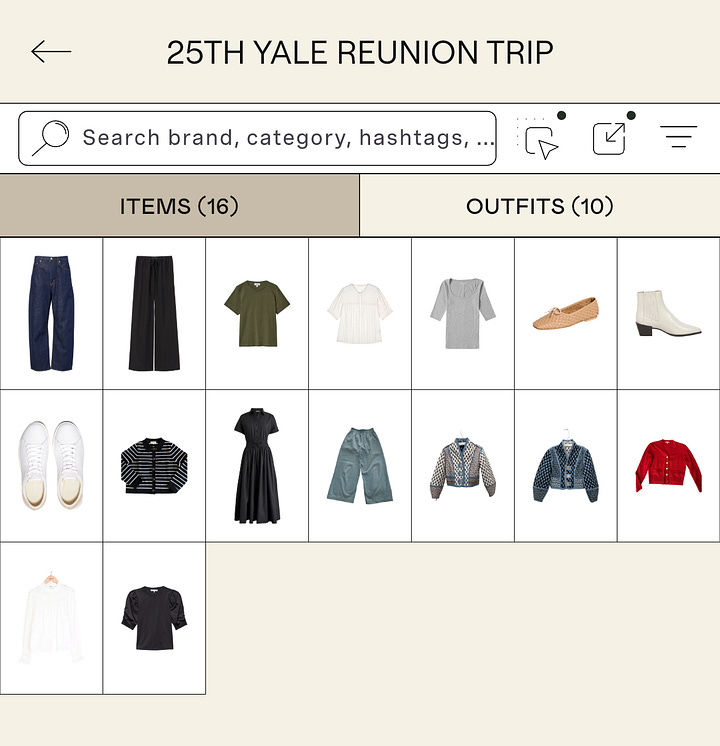 Start packing for trips early. Packing is the use case that first got me hooked on Indyx (I told Yidi it was my “gateway drug”). Ever since I hired Conni Jespersen to help me pack for a multi-week book tour, I’ve followed her packing process, which involves taking pictures of outfits. Now I create a collection in Indyx a few weeks before a trip and start building complete outfits rather than throwing random pieces in a suitcase. I’ve used Indyx to pack for 6 trips so far, from long weekends to 2+ week trips, and I’m proud to say it’s helped me avoid travel-induced panic shopping, even for a week on the East Coast that included a 20-degree temperature range, work meetings, and my college reunion!